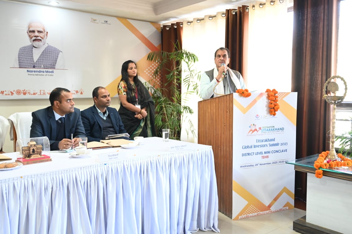 टिहरी। उत्तराखण्ड वैश्विक निवेशक सम्मेलन-2023 के तहत बुधवार को कैनिनेट मंत्री/जनपद प्रभारी मंत्री प्रेम चंद अग्रवाल द्वारा जिला स्तरीय मिनी कॉन्क्लेव का विधिवत् दीप प्रज्जवलित कर शुभारंभ किया गया। गंगा रिजॉर्ट (जी.एम.वी.एन.) मुनि की रेती, टिहरी गढ़वाल में आयोजित कार्यक्रम में कैबिनेट मंत्री प्रेम चंद अग्रवाल ने कहा कि आज उद्यमी उत्तराखण्ड में निवेश करने में उत्साह दिखा रहे हैं और इसका बड़ा आधार यहां का वातावरण, सौन्दर्यीकरण के साथ ही शांति एवं कानून व्यवस्था, ट्रांसपोर्टेशन, विद्युत, रेलवे लाइन, उड़ान सेवा आदि हैं, जो उद्यमियों को आकर्षित कर रहा है। कहा कि उत्तराखण्ड में लंेड बैंक हेतु 600 एकड़ भूमि निकाली गई है। इसके साथ ही सिंगल विंडों सिस्टम पर जनपद एवं राज्य स्तर पर कार्य हो रहा है, जिसमंे सभी का सहयोग जरूरी है। मा. प्रधानमंत्री जी का उत्तराखण्ड के प्रति विशेष लगाव है, उन्होंने बाबा केदारनाथ की धरती से कहा कि अगला दशक उत्तराखण्ड का दशक होगा और मा. मुख्यमंत्री के मार्गदर्शन में राज्य सरकार लगातार इस हेतु प्रयासरत है। इस साल चारधाम यात्रा में रिकार्ड तोड़ 56 लाख श्रद्धालु पहुंचे। जनपद प्रभारी मंत्री श्री अग्रवाल ने कहा कि जनपद में पर्यटन की अपार सम्भावनाएं हैं, टिहरी झील विश्व के लोगों के लिए आर्कषण का केन्द्र रहा है, जिसमें हाल ही में ‘‘टिहरी एक्रो फेस्टिवल‘‘ सफलतापूर्वक सम्पन्न हुआ। इसके साथ ही जनपद में जी-20 की दो अर्न्तराष्ट्रीय बैठकें सम्पन्न हुई हैं तथा उद्यमियों के लिए निवेश करने हेतु यह अनुकूल जिला है। उन्होंने कहा कि कॉन्क्लेव में प्राप्त सुझावों को गम्भीरता से लेते हुए समाधान की ओर बढ़ेगें।